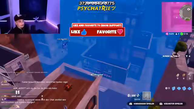00:17:15Der Streamer setzt sein Fortnite-Spiel fort, kämpft um Positionen und Loot und muss einen gegnerischen Spieler eliminieren. Wichtige Waffen wie eine goldene Pump werden gefunden. Während des Spiels treten erhebliche technische Probleme auf. Melissa verliert die Verbindung, was zu Unruhe führt, und der Streamer selbst muss seine Internetverbindung überprüfen. Die Game-Session unterbricht sich aufgrund dieser Verbindungsprobleme.