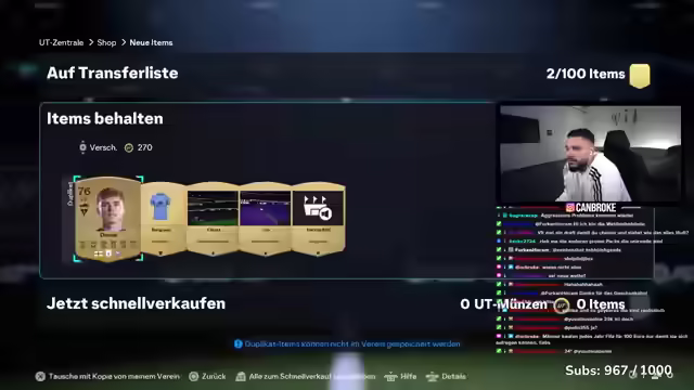 05:02:47Es wird diskutiert, wie viel Geld man realistisch aus 500 Euro an Packs ziehen kann. Andere Streamer berichten von ihren Ausgaben und Ergebnissen. Der Streamer erzählt von früheren Erfahrungen, als er FIFA vorab hatte und damit Coins generieren konnte. Die Zuschauer diskutieren, was im Spiel Spaß machen wird und schlagen eine RTG (Road to Glory) vor. Es wird überlegt, ob Obay gut spielt. Der Streamer erzählt eine Geschichte, wie er von Profi-Spielern blockiert wurde, weil seine Zuschauer deren Social-Media-Accounts mit Nachrichten überfluteten. Es wird über frühere FIFA-Spiele gesprochen und welche Spieler damals besonders beliebt waren. Der Streamer zieht weiterhin Packs und ist enttäuscht über die Ergebnisse. Er zieht Lea Schüller erneut und äußert seinen Unmut darüber. Es wird diskutiert, ob EA die Pack-Wahrscheinlichkeiten für Streamer beeinflusst, um das Spiel attraktiver zu machen. Ebru hat Cruyff gezogen, was die Diskussion über EA-Partnerschaften neu entfacht.