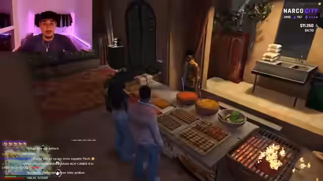 01:02:12Die Spieler erkunden die fiktive Stadt, verschiedene Läden und interactiven Orte. Sie finden einen offenen Laden und sprechen mit einem NPC namens Gerinja. Dieser gibt ihnen den ersten, einfachen Auftrag: die Kasse zu leeren. Nachdem sie Geld erbeutet haben, suchen sie nach weiteren Aufgaben. Eine neue Mission taucht auf, die in den Stadtteil Marrakesch führt, um dort Drogen zu besorgen. Spielerisch wird die Welt erkundet und die Charaktere interagieren miteinander.