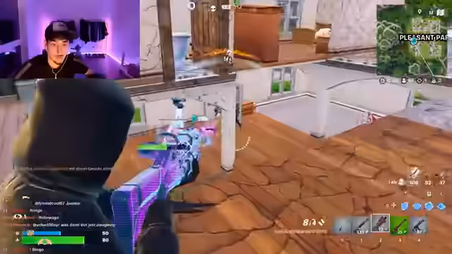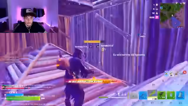 00:09:44Nach technischen Störungen geht es in ein Fortnite-Spiel. Der Streamer und seine Mitspielerin looten Häuser und Waffen, doch der Verlauf wird durch wiederholte Angriffe von sogenannten Stream Snipers gestört. Er benennt und beschuldigt gezielt Gegner, die unerwartet auftauchen und nur auf ihn zielen, was den Spielverlauf und seine Frustration erhöht. Gleichzeitig teilt er sich Ressourcen wie Waffen und Heilungsmittel mit seinen Mitspielern.