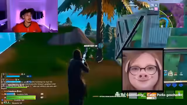01:16:15Der Streamer kehrt zu Fortnite zurück und spielt in einem Squad-Modus mit seinen Teammitgliedern. Das Gameplay ist intensiv und strategisch, mit Fokus auf das Platzieren von Strukturen, das Auffinden von Gegnern und das Überleben in der schrumpfenden Zone. Es kommt zu mehreren hitzigen Feuergefechten und dem Versuch, den gegnerischen Squad auszuschalten. Die Stimmung ist angespannt, aber das Team arbeitet zusammen, um eine gute Platzierung zu erreichen und einen Sieg zu erzielen.