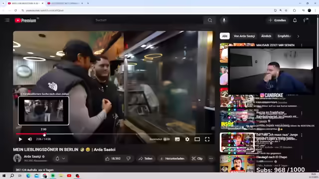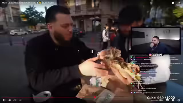 02:11:01Der Streamer findet den Döner stimmig und eine perfekte Symbiose. Er kritisiert, dass die Menschen in NRW den Döner oft mit Soßen vollbomben, sodass das Brot durchgeht. So zu essen findet er widerwärtig. Der Streamer erwähnt Iskander und dass er den Punkt gibt, dass es sein Lieblingsdöner in Berlin ist. Das Video wird ihm zu lange. Er kündigt an, weitere Döner zu testen. Wenn die Zuschauer weitere Videos von Adresso sehen wollen, sollen sie einen Daumen hoch geben. Danach reagiert der Streamer auf das Oktoberfest Video mit Corinna und Co. Er will wissen, wer Corinna ist.