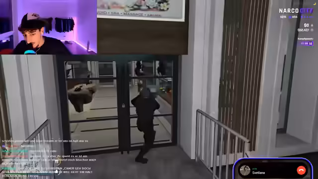 02:38:04Die eskalierte Situation führt zu einer Verfolgungsjagd durch die Polizei. Um der Festnahme zu entgehen, plant der Streamer, sich mit einem anderen Fahrzeug auszustatten und sich zu verkleiden. Er entscheidet sich für einen Van und kauft ein Affenkostüm, um unkenntlich zu bleiben. Gemeinsam mit seinen Begleitern will er daraufhin ein Nagelstudio stürmen, was einen entscheidenden Wendepunkt darstellt.