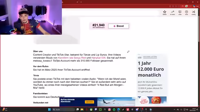05:16:36Der Streamer entdeckt zufällig, dass er in der App 'Famous Birthdays' aufgeführt ist. Er ist überrascht, dass er auf Platz 40.000 von allen Stars steht. Seine Beschreibung in der App wird vorgelesen und als teilweise ungenau beschrieben. Der Streamer ist verblüfft und auch etwas amüsiert über die Nennung seiner Person. Er ist stolz darauf, dass er als TikTok-Star mit über 900.000 Followern gelistet ist. Er will seinen Rank boosten.
