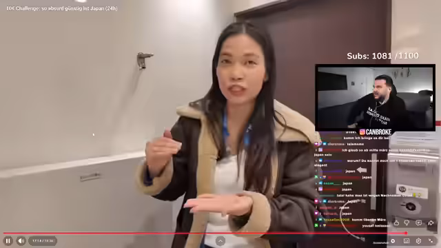 01:37:50Der Stream beginnt mit der Reaktion auf ein Video von Hasar, in dem sie die sogenannte 10-Euro-Challenge in Japan absolviert. Ein Budget von 1810 Yen, was dem Gegenwert von etwa 10 Euro entspricht, soll für einen ganzen Tag in Japan reichen. Die Reise beginnt in einem Konbini, wo typisches japanisches Frühstück wie Backwaren und Onigiri gekauft wird. Die Kommentatoren diskutieren die Preise in Japan und stellen fest, dass diese für Touristen aufgrund des schwachen Yen derzeit sehr günstig sind, während die Lebenshaltungskosten für die Einheimischen gestiegen sind.