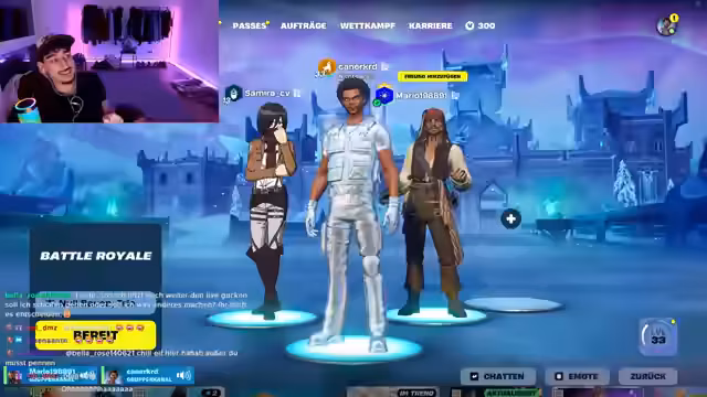03:07:05Ein Freund des Streamers namens Mario erscheint im Stream und behauptet, Kontakt zu Prominenten wie Ariana Grande, Selena Gomez und Taylor Swift zu haben. Diese Behauptung führt zu Skepsis und humorvollen Debatten im Chat. Gleichzeitig wird im Spiel versucht, sich mit einem Account namens 'Samira' zu verbinden, was jedoch auf technische Probleme stößt. Mario will dann mit dem Streamer ein Trio ohne Bauen spielen, was den ungewöhnlichen Abschluss des Streams darstellt.