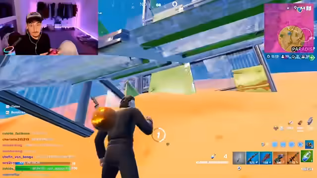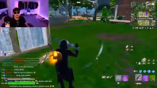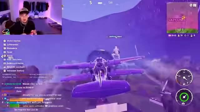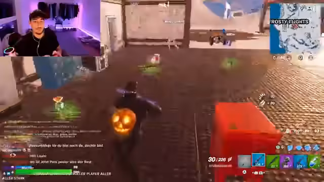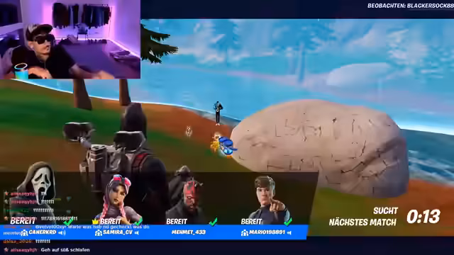 04:00:24Die Teilnehmer experimentieren mit verschiedenen Spielmodi in Fortnite. Sie spielen den Blitz-Modus, der auf einer sehr kleinen Karte stattfindet und für schnelle und actionreiche Kämpfe bekannt ist. Jeder Spieler erhält automatisch eine zufällige Waffe und das Ziel ist es, eine bestimmte Anzahl an Kills zu erzielen. Während des Spiels werden auch neue, ungewöhnliche Waffen wie ein Raketenwerfer mit Flugfähigkeiten und ein "Pokal", der Gegner sofort eliminiert, getestet und ihre Effektivität diskutiert.