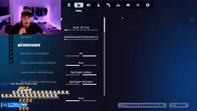 00:03:02Nach anfänglichen Problemen wird der Controller verbunden. Der Fokus liegt nun auf der Einrichtung der Tastenbelegung und der Empfindlichkeit für einen optimalen Spielstil. Der Streamer entscheidet sich für die Befehle 'O zum Bauen' und 'L2 zum Rennen', findet die voreingestellten Werte aber noch unzureichend und passt sie in der Folge an. Dabei werden Einstellungen wie 'Baumeister Pro' und die 'Ego-Perspektive' geprüft, um sich an den neuen Controller zu gewöhnen.