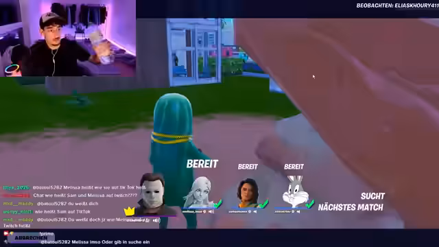 00:13:45Gemeinsam mit Melissa wird ein Battle-Royale-Spiel bestritten. Beide landen in einer Stadt und sammeln Loot, wobei die Nutzung von Lebensmitteln wie Pilzen und der Aufbau von Deckungen eine zentrale Rolle spielen. Sie kämpfen sich durch die verkleinerte Zone und bauen Basisstrukturen. Obwohl sie in mehrere Gefechte verwickelt werden und der Streamer mehrmals niedergemacht wird, können sie sich jeweils heilen und eine gute Waffenausrüstung aufbauen.