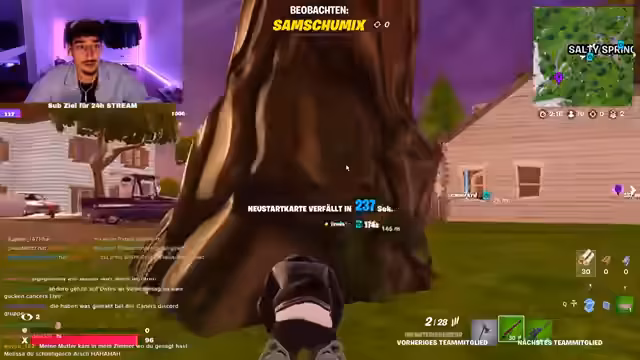 00:09:15Der Streamer wechselt zum Spielen von Fortnite und versucht, sich mit seinen Teammitgliedern wie Melissa zu verbinden. Es kommt zu technischen Problemen und unzähligen Spam-Nachrichten, insbesondere von einem Nutzer mit der Spende '1,75 Euro', was den Streamer verärgert. Trotzdem lobt er Zuschauer, die Subs verschenken, und versucht, das Spiel ernst zu nehmen, während der Chat und das Gameplay sich gegenseitig beeinflussen.