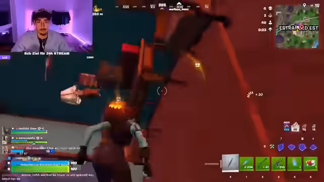 00:17:45Ein Hype Train löst sich im Chat aus und der Streamer nutzt die positive Energie, um seine Community zum Sieg in Fortnite zu motivieren. Das Gameplay wird intensiver und teamorientierter, da sich die verbleibenden Spieler in einer kleineren Zone sammeln müssen. Er koordiniert Aktionen, teilt Beute aus und feiert kleine Siege, während der Chat weiter mit Spenden und Cheers unterstützt.