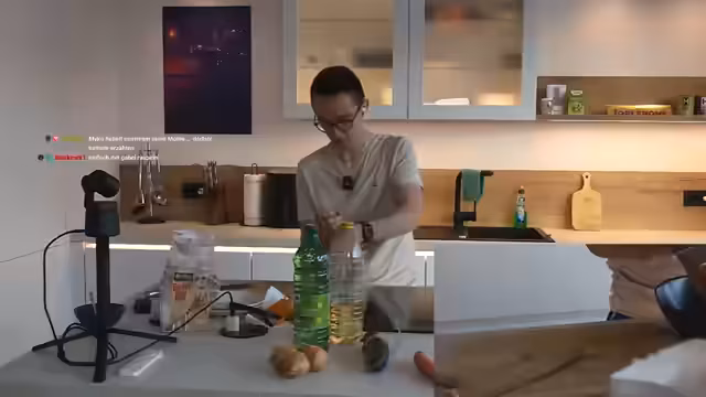 00:00:01Der Stream beginnt mit einer herzlichen Begrüßung und der Vorstellung von Co-Koch Chad. Die Zutaten für ein asiatisches Gericht werden präsentiert, darunter Zucchini, Möhren, Zwiebeln, Essig, Sojasauce, Sesamöl und Chiliflocken. Besonderes Augenmerk liegt auf einer Paste, deren intensiver Geruch im Studio bemerkt wird. Streamer und Chad betonen, dass es sich um ein vegetarisches Rezept handelt, um das Risiko eines Fehlschlags zu minimieren. Die Zuschauer werden zur Mitgestaltung eingeladen, jedoch soll das Rezept nicht extern gesucht werden.