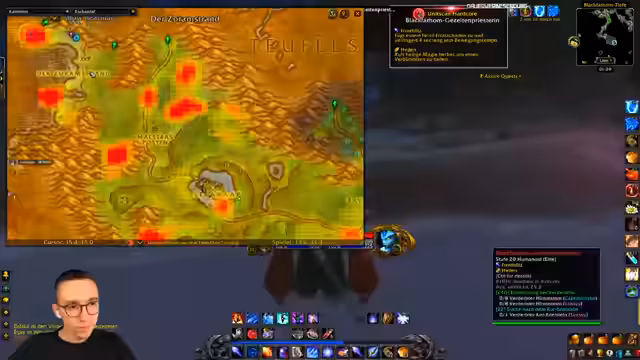 01:08:01Zu Beginn des Streamabschnitts wird ein spontaner Zauberfehler thematisiert, der unentdeckt blieb. Im Mittelpunkt steht der Fortschritt im Leveling, insbesondere in der Dunkelküste, wo der Streamer eine Quest mit einem Fragezeichen-Icon findet. Trotz Unsicherheit wird das Abgeben in Kauf genommen. Es werden Instant-Angriffe wie Arcane-Explosion und Feuerschlag als Teil des Zauberrepertoirs erwähnt. Aufgrund der hohen Anzahl an Instanz-Slots wird der Wert von Beutegut wie Muschelfleisch hinterfragt, und die Möglichkeit, es zu verarbeiten oder direkt zu verkaufen, wird als mühsam eingestuft.