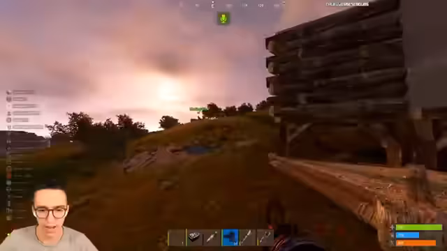 04:38:34Die ausgerüstete Gruppe startet als massiver Roam in Richtung des geplanten Bauplatzes AB8. Unterwegs werden Ressourcen wie Holz gesammelt und Tiere für Nahrung erlegt. Am Zielort angekommen, wird die feindliche Starter-Basis eines anderen Spielers erstürmt. Nachdem der Base-Eigentümer die Tür öffnet, stürmen mehrere Community-Mitglieder hinein, um ihn zu eliminieren und die Base für den eigenen Bau freizumachen.