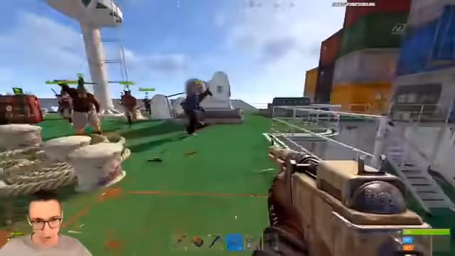 08:12:27Nach der Landung auf dem Cargo-Ship bricht ein Kampf aus. Die Gruppe kämpft mit Waffen wie Pumpguns, Crossbows und Machetes gegen feindliche Spieler. Die Strategie besteht darin, sich vorne bei der Kiste zu versammeln und als eine Einheit vorzurücken, um Verluste zu minimieren. Trotzdem kommt es zu Todesfällen und die Gruppe muss die Leichen looten, um Ressourcen und Munition sicherzustellen. Der Feind wird aus verschiedenen Richtungen attackiert, was die Situation unübersichtlich macht.