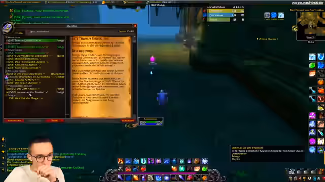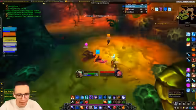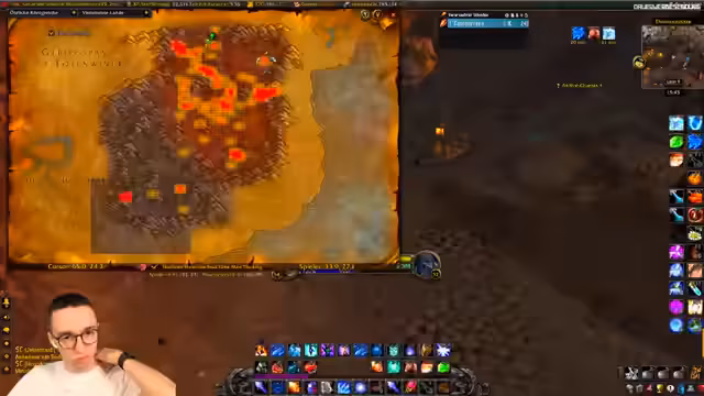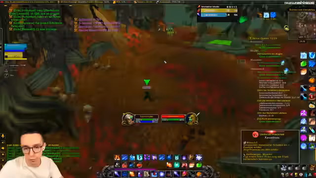 01:15:55Der Streamer beginnt mit der gefährlichen Elite-Quest 'Gebet an Elune' in der Sengenden Schlucht. Die Gegner, Twilight-Dunkelschamanen und -Feuerwachen, sind sehr gefährlich, da sie starken Feuerschaden und AOE-Zauber verursachen. Trotz der hohen Gefahr und des hohen Mana-Verbrauchs nimmt er die Quest in Angriff, da er das Symbol von Ragnaros für einen Gegenstand benötigt.