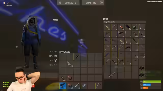 05:09:35Begegnung mit einem Spieler, den sie aus früheren Streams kennen. Die Situation wird als "krazy" beschrieben und es wird über die nächste Kiste gesprochen. Sie überlegen, ob sie einen Wissenschaftler looten und nutzen die Tauchzeit, um die Ressourcen zu transportieren.