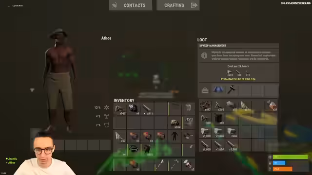 13:13:01Der Streamer stellt fest, dass nur noch zwei, drei Kader an vorhanden sind und denkt über den dekadenten und sparsamen Umgang mit dem restlichen Stoff nach. Es folgt eine aufwendige Diskussion über Design und Platz in der Base, die als geistig krank und blockierend empfunden wird. Die Laune sinkt, und es wird klar, dass eine grundlegende Veränderung nötig ist, wie der Bau eines großen Pools und eines Airlocks als Verteidigungsmaßnahme.