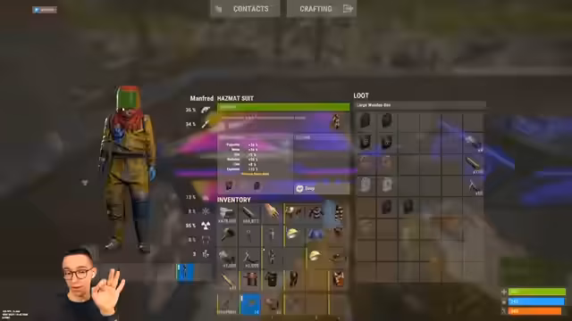 01:01:28Der Streamer experimentiert mit dem neuen Crafting-System und testet, wie man durch Asbestos-Platten in der Rüstung die Strahlung vom Launch-Top abwehren kann. Es wird gezeigt, dass man mit drei passenden Rüstungsteilen und je 50 Metallfragmenten für Platte ausreichend Strahlenschutz erreichen kann. Das Experiment bestätigt, dass die Mechanik funktioniert und somit ein effektiver Schutz gegen die Umgebungsgefahren der neuen Zone möglich ist, ohne die Ausrüstung komplett zu ersetzen.