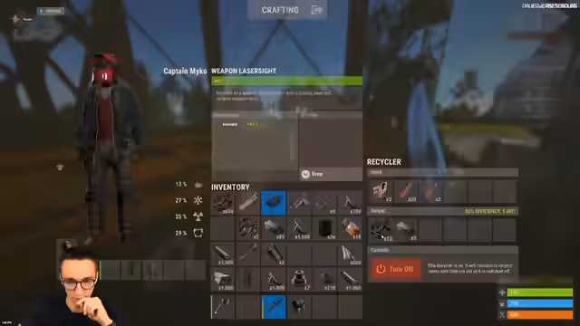 06:14:15Ein kurzer Versuch, eine feindliche Basis aus der Nähe zu sondieren, wird unternommen, bei dem ein Gegner auf einem Baum gesichtet wird, was als beunruhigend empfunden wird. Letztlich wird ein spontaner Minikopter-Raid auf eine feindliche Basis gestartet, mit dem Ziel, sie mit neun Raketen zu öffnen. Der Angriff scheitert jedoch, da der Eindringling von Shotgun-Traps getötet wird und fast kein Loot erbeuten kann. Die Gegner sind dabei sofort bereit, was den Frust über die gescheiterte Aktion und die ineffektive Nachtzeit, in der man kaum etwas sehen kann, verschärft.