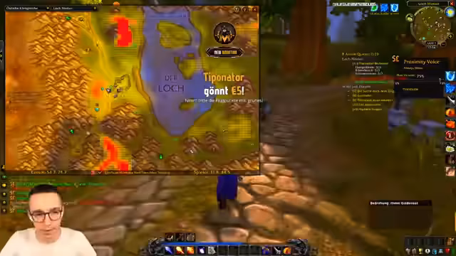 01:11:48Ein zentraler Schritt ist die Integration in die 'Sauerkraut'-Gilde, um den Status von Spielern zu sehen. Nach Einladung und Annahme der Einladung ist er offiziell Mitglied. Die Kommunikation im Voice-Chat ist anfangs holprig, da er technische Schwierigkeiten mit der Push-to-Talk-Funktion und der Lautstärkeregelung hat. Er testet die Verbindung und ist hocherfreut, als er plötzlich andere Gildenmitglieder wie 'Jonsi' hört und eine funktionierende Gruppensicherung aufbaut.