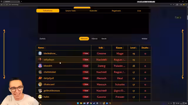 00:19:17Auf der Event-Website wird sichtbar, dass alle großen Streamer wie Trimax, Metashi und Krokobus die Allianz-Fraktion 'Mensch' gewählt haben. Dies führt zu einer extremen Konzentration von Spielern in den Startgebieten. Der Streamer äußert seine Nervosität über die anfängliche Überlastung und die Konkurrenz um Mobs und Ressourcen.