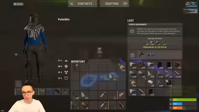 04:19:16Bei der Rückkehr zur Basis stellt der Streamer fest, dass seine Kisten voll sind und er Platz schaffen muss. Er geht in ein nahegelegenes Lab, um es zu durchsuchen. Dort findet er viel Loot, darunter ein komplettes Tauchset, aber auch ein seltsames und umständliches Lab-Design. Er beschreibt den Trip als 'Movie-ähnlich' und voller Spannung. Anschließend plant er, das Eurig zu countern, um an weitere Ressourcen zu gelangen, stellt aber fest, dass er kein Boot zur Verfügung hat.