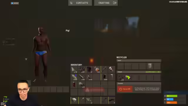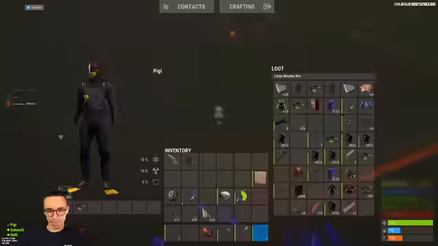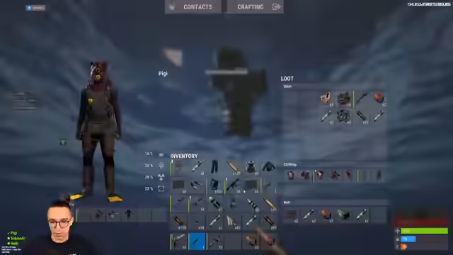08:42:19Es wird nach einer guten Holzrüstung gesucht. Die Rucksäcke sind gepackt. Metallfragmente werden aus dem Ofen geholt. Ein Nachtfischer wird eingepackt. Die Tauchausrüstung wird vorbereitet. Es wird geprüft, ob sich noch etwas im Tool Cupboard befindet. Eine bessere Waffe wird gewünscht und eine LR angeboten. Munition befindet sich in einer Kiste. Ein Speargun wird dazugelegt. Die Tauchausrüstung wird mitgenommen. Es wird sichergestellt, dass jeder ein Diving-Set hat. Es wird nach einer zusätzlichen Westfield gefragt. Eine P2 wird eingepackt. Die Rucksäcke werden gefüllt, bevor es hell wird. Alles, was noch in der Kiste ist, soll mitgenommen werden. Überlebenswichtige Dinge sind wichtiger als eine schwere Rüstung. Ein Light Vision wird gefunden. SMG-Buddies werden gestapelt. Komponenten werden in eine große Kiste gepackt. Holz wird möglicherweise auch mitgenommen. Es wird überlegt, ob man bereit zum Aufbruch ist. Ein Redsight soll gedroppt werden. Es wird beschlossen, nicht direkt an der Basis hochzugehen, da man im Wasser gut sichtbar ist.