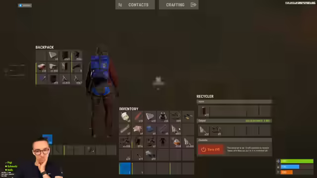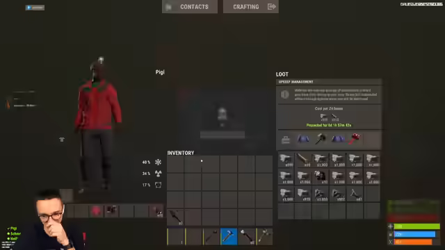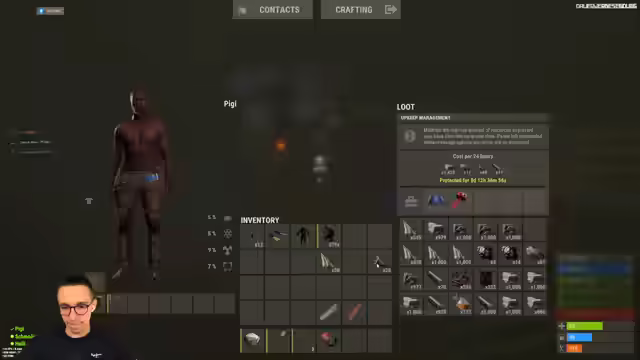 08:39:21Es wird diskutiert, ob man in der Nacht umziehen oder farmen soll. Ein Umzug in der Nacht wird als beste Option angesehen. Es wird beschlossen, einen Rucksack zu füllen. Wertvolle Gegenstände wie Red Kika und High-Tier-Loot sollen mitgenommen werden. Alle Komponenten, einschließlich einer Real Rocket, werden eingepackt. Es werden drei Nachtsichtgeräte gezählt. Stoff und Schrott werden als wichtig erachtet und mitgenommen. Es wird überlegt, was zurückgelassen werden soll. Die Notwendigkeit, die Vorräte aufzustocken, falls man stirbt, wird betont. Es wird beschlossen, Taucherausrüstung vorzubereiten und in einer Kiste zu verstauen. Etwas Stoff soll zurückgelassen werden, um sich hochzuziehen. Eine Waffe und Munition werden für den Fall der Fälle bereitgelegt. Es wird festgestellt, dass noch Stein vorhanden ist.