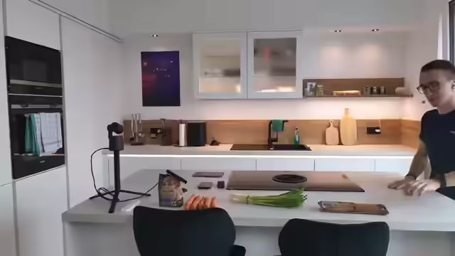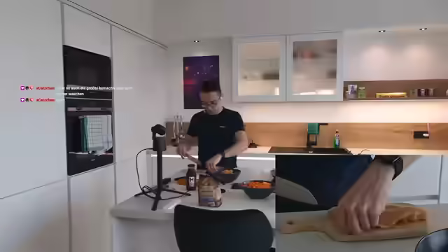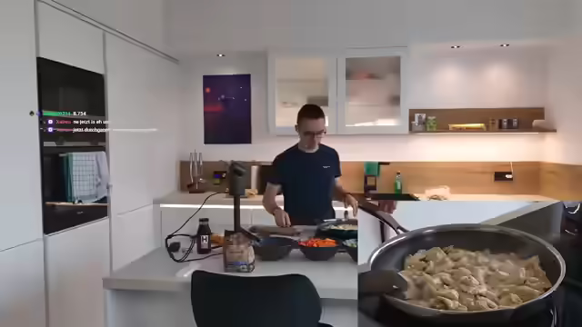 00:09:58Der Stream beginnt pünktlich um 16 Uhr mit der Ankündigung, ein asiatisches Gericht zu kochen. Der Koch bereitet Teriyaki-Nudeln zu und diskutiert, ob er eine fertige Teriyaki-Soße von Henssler verwenden oder sie selbst zubereiten soll. Er entscheidet sich, die Soße selbst zu machen, stellt aber fest, dass er fast keine Sojasauce mehr hat, was zu einem Problem führt. Es werden Vollkornspaghetti anstelle von Glasnudeln verwendet, und die größte Herausforderung wird darin gesehen, die Karotten klein zu schneiden. Die neue Henssler-Pfanne wird vorgestellt, wobei die Spülmaschineneignung und die Möglichkeit, darin zu schneiden, diskutiert werden. Der Koch äußert Bedenken, die Pfanne zu beschädigen, möchte aber dennoch testen, ob man darin schneiden kann, wie es Henssler selbst angeblich tut. Es wird überlegt, ob Edamame vor dem Braten kurz ins Wasser gegeben werden soll. Der Streamer betont, dass er selten asiatisch kocht und unsicher ist, wie man es richtig macht, insbesondere im Hinblick auf die Zubereitung von Gemüse.