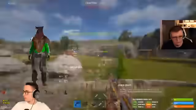 01:04:22Das Team sammelt Ressourcen wie Satchels und Metallsplitter für einen geplanten Raid auf eine gegnerische Basis. Während der Vorbereitung kommt es zu einem verbalen Streit zwischen den Spielern, als einer der beiden einen riskanten Move macht und den anderen vor eine schwere Entscheidung stellt, um den Zusammenhalt im Team zu wahren.
