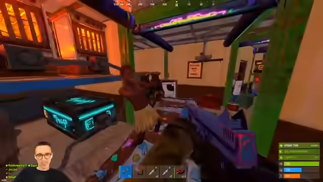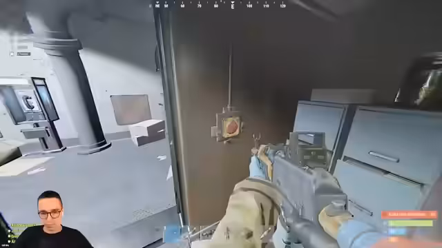 06:25:22Ein Gegner, der nackt und unbewaffnet in die Basis eingedrungen ist, hat den Streamer überraschend ausgeraubt und seine E-Launcher gestohlen. Obwohl er eingekesselt war, gelang es dem Eindringling, gesamten Loot am Körper zu tragen und unerreichbar zu verschwinden. Ein weiterer Gegner wurde verletzt angetroffen, eine gemeinsame Aktion mit einer Granate oder Satchel im Aufzug schien erfolglos, da der Aufzug zu langsam ist. Ein Kampf brout aus, bei dem mehrere Gegner an der Tür auftrafen, einer getötet wurde, aber der Streamer letztlich im Kampf fiel und Respawnen musste.