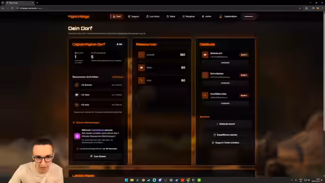 07:21:53Es werden die ersten Schritte im Cap Michael Village Game demonstriert, inklusive des Baus eines Ofens und einer Werkbank. Nach Erhalt von Ressourcen können Spieler den Ofen nutzen, um Metall zu schmelzen und anschließend eine Werkbank zu errichten. Die Werkbank ermöglicht es, Schießpulver und C4 herzustellen, welche für Raids benötigt werden. Im Vergleich zu anderen Spielen wie Rust sind die benötigten Ressourcen für C4 geringer. Es wird angekündigt, dass es im Discord eine offizielle Ankündigung geben wird, sobald das Spiel fertig ist und ein Wipe stattfindet. Derzeit dient alles nur dem Testen und der Fehlersuche. Es wird auch überlegt, ob man das Dorf in einen Clan umbenennen soll, falls mehrere Dörfer zusammenarbeiten. Um Ressourcen für Angriffe zu sammeln, muss man das Dorf aufklären, was 500 Schrott kostet. Spieler müssen ihren Twitch-Account verknüpfen, um Ressourcen zu sammeln, auch wenn das Dorf nicht im Hintergrund geöffnet ist.