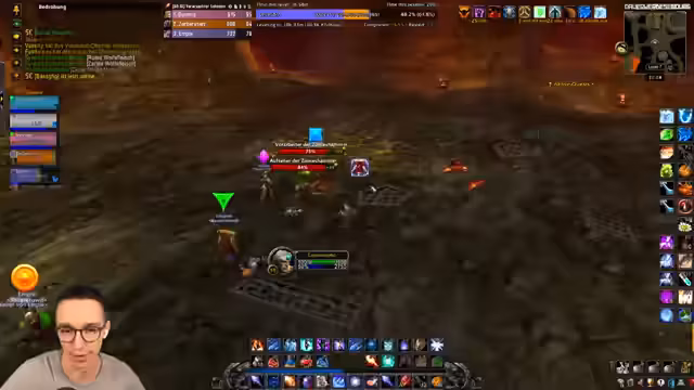 08:55:57Das Team kämpft sich zu den letzten beiden Bossen des Dungeons, dem großen Eisen-Golem und dem Rad der sieben Zwerge. Es wird eine komplexe Taktik für den Golem-Boss ausgeführt, bei der der Tank die Gegner an eine bestimmte Position zieht, während das Restteam die Casters eliminiert. Anschließend wird der Bosskampf mit den sieben Zwergen geplant und durchgeführt, bei dem jeder Zwerg eine andere Fähigkeit hat. Nach einem erfolgreichen Full Clear bis auf die letzten Endbosse wird der Weg zum Molten Core geöffnet und eine erste Erkundung des Raid-Eingangs geplant.
