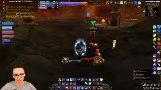 06:21:35Nach der Arena geht die Reise weiter durch das Dungeon. Es werden verschiedene Räume durchquert und Mobs gepullt. Die Kommunikation in der Gruppe ist entscheidend; zum Beispiel wird ein Magie-Anwender gebeten, bestimmte Mobs mit Gedankensicht zu scouten, um die Positionen der Feinde auszukundschaften. Dabei kommt es zu technischen Problemen, bei denen ein Spieler aus der Gruppe geflogen ist. Auch die Eroberung eines Schlüssels für den weiteren Fortschritt im Dungeon ist ein Thema.