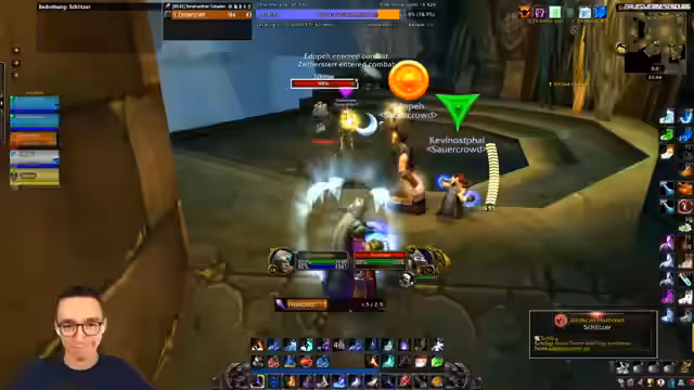 02:01:06Der Streamer und seine Gruppe orientieren sich zunächst im Dungeon, als sie fälschlicherweise eine falsche Plattform betreten. Sie korrigieren ihren Kurs und suchen den Instanzeingang, wobei sie sich über die richtige Richtung nach Norden unsicher sind. Nachdem sie die korrekte Tür finden, wird die Effektivität der Gruppe durch einen Mage mit 'Enchanted Temposteigerung' erhöht. Die Unterhaltung unter den Spielern ist locker und beinhaltet auch humorvolle Auseinandersetzungen über Jugendsprache und eine Diskussion darüber, wer 'taff' ist.