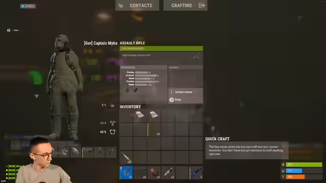 04:06:36Eine Infiltrationsmission in eine arktische Basis wird durchgeführt, um verlorenen Loot zurückzuholen. Es wird nach einem Weg gesucht, um auf das Dach zu gelangen. Nach anfänglichen Schwierigkeiten gelingt es dem Streamer, auf dem Dach zu landen. Es kommt zu einer kurzen Koordination mit einem Teamkameraden, um Loot auszuschaffen. Als der Streamer versuchen will, zurück ins Gebäude zu gelangen, stellt er fest, dass die Basis offenbar aufgegeben oder geräumt wurde, da er den geforderten Loot nicht findet. Er sucht nach verbleibenden Ressourcen wie Sulfur.