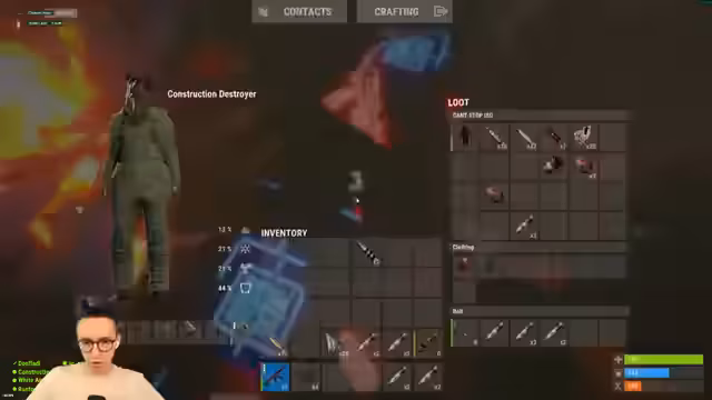 08:56:54Ein Raid wird erfolgreich abgeschlossen. Nach dem Eindringen in die Base mit C4 und Rockets wird das TC geöffnet. Es wird eine große Menge an Loot wie 20 Backs und 1080 Scrap gefunden. Der Streamer ist begeistert vom Erfolg und hat sogar Probleme, alles aufzunehmen.