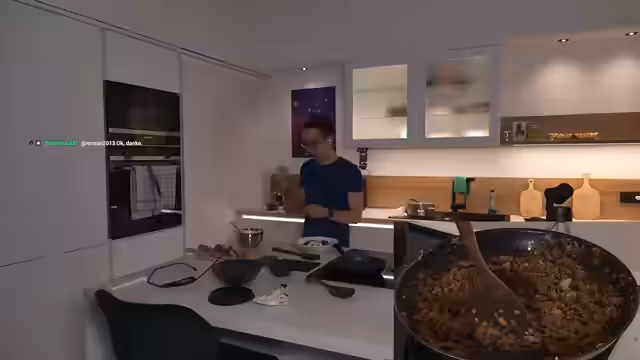 00:10:00Nach der Begrüßung des Streams verkündet der Koch sein Vorhaben, eine türkische Pasta zuzubereiten. Er erörtert die scheinbare Widersprüchlichkeit des Rezepts, da Pasta eigentlich italienisch ist, und stellt die einfache Zutatenliste und die angebache Leichtigkeit der Zubereitung in den Vordergrund. Der Streamer bezieht den Chat aktiv mit ein, diskutiert über die Herkunft von Pasta und stellt seine Fähigkeiten in Frage, während er mit der Vorbereitung der Zutaten wie Zwiebeln, Honigtomaten und Knoblauch beginnt.