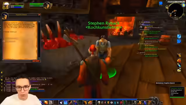 01:46:58Maiko betritt zum ersten Mal die Welt von WoW und erkundet Stormwind. Er bemerkt Markierungen über Charakteren und diskutiert mit dem Chat über Spielmechaniken wie Coin-Markierungen und Level-Anstiege. Dabei entdeckt er erste Quests,NPC-Interaktionen und die Bedeutung von grünen Ausruhrzeichen auf der Karte. Er absolviert den Quest 'Spiegelsee' und reflektiert über das nostalgische Quest-Design und die Offene-Welt-Struktur, die er mit modernen Spielen wie Rust vergleicht.