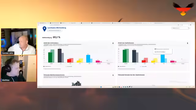 00:10:02Der Stream wird um 17:30 Uhr gestartet, und es gibt erste technische Probleme bei der Bildqualität des Co-Moderators Matthias, welche jedoch nach kurzer Zeit behoben sind. Die Moderatoren begrüßen die Zuschauer auf verschiedenen Plattformen und kündigen an, gemeinsam durch den Wahlabend zu führen. Thematisch stehen heute die Landtagswahlen in Baden-Württemberg und Bayern sowie die Landratswahl im Spree-Neiße-Kreis im Fokus. Ein kurzer Überblick zu den Erwartungen für die Wahlausgänge rundet den Einstieg ab.