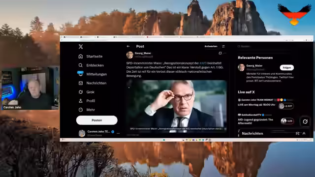 00:55:02Der Streamer greift die Aussagen von Thüringens Innenminister Georg Meier aufs Korn, der eine angebliche Deportation deutscher Staatsbürger durch die AfD behauptet. Er entkräftet diese Anschuldigung als glatte Lüge und dechiffriert das Framing der SPD: Wer den Nationalstaat Deutschland und den Austritt aus der EU ablehnt, wird als ‚völkisch-nationalistisch‘ diffamiert. Meiers Aussagen werden von ihm als reine Angst vor dem Machtverlust und vor der Aufdeckung von Skandalen im thüringischen Verfassungsschutz interpretiert.