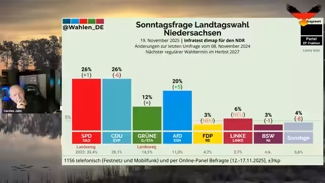 00:13:35Nachdem zunächst eine von ihm als veraltet eingestufte INSA-Umfrage gezeigt wurde, präsentiert der Streamer die aktuellen Daten von Forsa, RTL/NTV. Diese zeigen entgegen der medialen Hetze der Vorwoche, die nach einem Skandal AfD-Wähler abschrecken sollte, einen leichten Anstieg der AfD auf 26%. Dies interpretiert er als Beweis, dass die Kampagne der Altparteien und Medien nach hinten losgeht und die Bevölkerung ihre Taktik durchschaut.