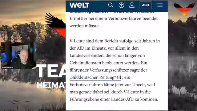01:01:18Ein zentraler Skandal ist die Behauptung, der Verfassungsschutz setze V-Leute in Führungspositionen der AfD, um deren Verfassungsfeindlichkeit erst zu konstruieren. Dies wird durch einen Bericht der Welt untermauert und als einzigartiger und undemokratischer Akt in Deutschland bezeichnet. Der Streamer zitiert AfD-Politiker, die dieses Vorgehen als skandalös und als Versuch bezeichnen, die Partei durch Infiltrierung als verfassungsfeindlich erscheinen zu lassen. Dies wird als Verstoß gegen eigene Gesetze der Behörde dargestellt.