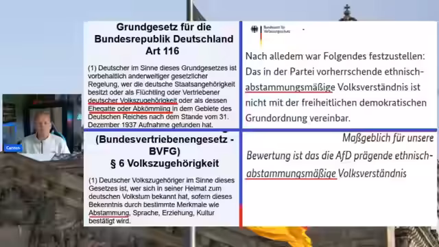 00:23:51Der Streamer legte dar, dass die Einstufung der AfD nicht auf Beweisen, sondern auf Meinungsäußerungen basiert und somit das Grundgesetz verletzt. Er kritisierte, dass die Medien, wie der Spiegel, die Anschuldigungen unkritisch übernehmen und so als Teil eines Regierungsschutzprogramms fungieren. Es wurde betont, dass die Einstufung einen direkten Eingriff in die Grundrechte darstellt und gegen Artikel 3 des Grundgesetzes verstößt, der die Benachteiligung aufgrund politischer Anschauung verbietet. Die gesamte Aktion wird als letztes verzweifeltes Aufbäumen der Kartellparteien gewertet, die Angst vor der wachsenden Macht der AfD haben.