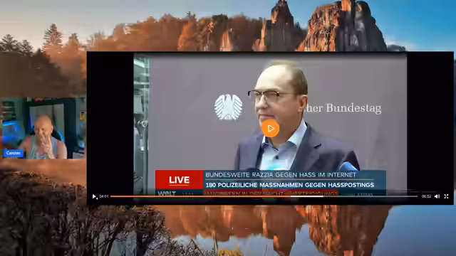 00:10:02Der Stream beginnt mit einer allgemeinen Begrüßung an die Zuschauer aus verschiedenen Regionen. Es wird der positive Zuspruch erwähnt, mit vielen Zuschauern, die seit Monaten dabei sind und neue Abonnenten begrüßt werden. Anschließend wendet sich der Streamer dem Hauptthema des Tages zu: einer bundesweiten Razzia, bei der die Polizei an über 170 Orten im Einsatz war. Es geht um Vorwürfe der Volksverhetzung und Beleidigung von Politikern, die laut Bundeskriminalamt im vergangenen Jahr zu 10.000 erfassten Straftaten führten, was ein Drittel mehr als im Vorjahr ist.