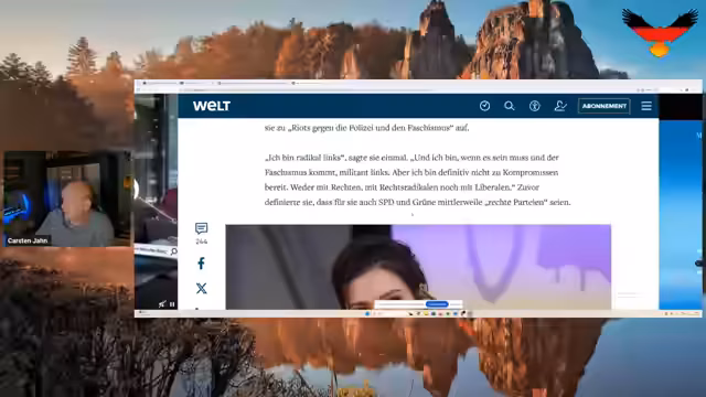 00:10:00Der Stream beginnt mit einer Begrüßung der Zuschauer auf Team Heimat live, wobei die Sendung heute verkürzt bis 19:40 Uhr läuft. Es wird eine Vielzahl von Orten genannt, aus denen die Zuschauer kommen, darunter Rheinland-Pfalz, Niederbayern, Bielefeld, Kerpen, Stralsund, Saarlouis, Stuttgart, Fellbach, Koswig, Ellwangen, Hannover, Halle, Saale, Essen, Bad Aibling, Schöningen, Pirmasens, Kalpespanien, Rhein-Sieg-Kreis, Lichtenberg, Aschersleben, Mittelfranken, Rödevisch, Oberrhein, Bünde, Baden-Württemberg, Magdeburg, Eckernförde, Bulgarien, Warner, Rügen, Speichingen, Arbenberg, Oberlausitz, Brilon und das Hunsrück. Die Aufmerksamkeit richtet sich schnell auf einen Artikel der 'Welt' über 'Linksradikale auf Twitch', der mit großer Ironie und Empörung kommentiert wird. Der Artikel thematisiert Transaktivisten, die Tipps zur illegalen Hormonbeschaffung geben, und Aufrufe zum Wahlbetrug gegen die AfD. Es wird kritisiert, dass Twitch, ursprünglich eine Gaming-Plattform, sich politisiert hat und nun extreme Inhalte toleriert und fördert, was als 'Wahnsinn' bezeichnet wird. Der Streamer betont, dass sein Kanal im Gegensatz dazu eine 'gewaltige Bildungsoffensive' bieten möchte.