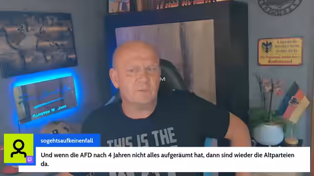 01:55:45Am Ende des Streams wird die Stabilität der aktuellen Bundesregierung infrage gestellt. Der Streamer prognostiziert, dass die Koalition aus CDU, SPD und Grünen nicht die gesamte Legislaturperierte überstehen wird. Der immense Druck von unten, die ungelösten Probleme und die anstehenden Landtagswahlen könnten dazu führen, dass die Regierung schon im nächsten Jahr zu wackeln beginnt. Die CDU wird als einzige Partei gesehen, die die Macht zum Wenden hat, steht aber durch die "Brandmauer"-Strategie vor einer großen Herausforderung.