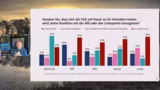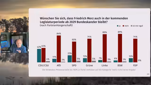 Im Rahmen politischer Analysen wurden Umfragen präsentiert, die eine Zufriedenheit mit dem Bundeskanzler bei nur 18% zeigen. Besonders deutlich war der Vertrauensverlust bei CDU/CSU-Wählern, während die AfD im Westen auf 24% und im Osten auf 38% zulegte. Experten diskutierten mögliche politische Veränderungen und ihre Auswirkungen.