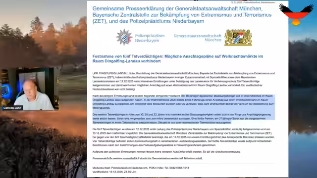 00:17:46In Dingolfing/Niederbayern wurde ein geplanter Anschlag auf einen Weihnachtsmarkt vereitelt. Fünf Tatverdächtige wurden festgenommen. Offizielle bayerische Stellen betonten die Beteiligung deutscher Behörden ohne ausländische Geheimdienste, während Medien einen Hinweis aus dem Ausland zitierten. Diese Diskrepanz zeigt erneut Widersprüche in der Berichterstattung. Der Stream wies auf mögliche Motive und die Notwendigkeit von Sicherheitsmaßnahmen hin, ohne Details zum Täterkreis.